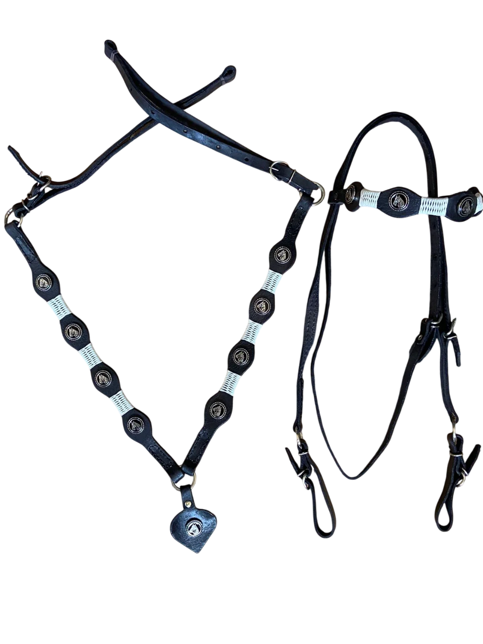 Peitoral e Cabeçada todo enfeitado com apliques de Cavalo em alumínio polido;
