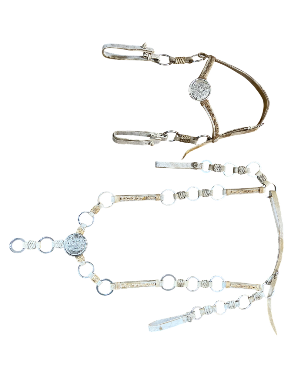 Conjunto artesanal confeccionado em couro cru de alta qualidade, ideal para quem busca resistência, beleza e tradição na montaria. A peça conta com aplique decorativo em metal com detalhes trabalhados, trazendo um toque de personalidade e elegância ao acabamento.