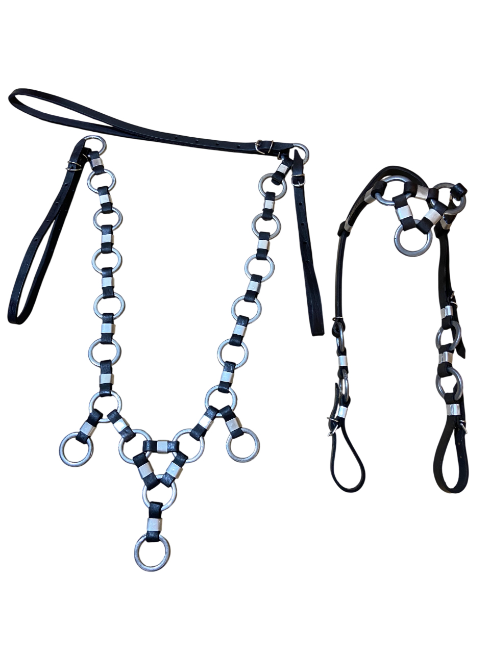 A cabeçada oferece ajuste prático e confortável, proporcionando melhor adaptação ao animal. O peitoral é reforçado e conta com design diferenciado em argolas, distribuindo melhor a pressão e trazendo mais firmeza durante o uso.