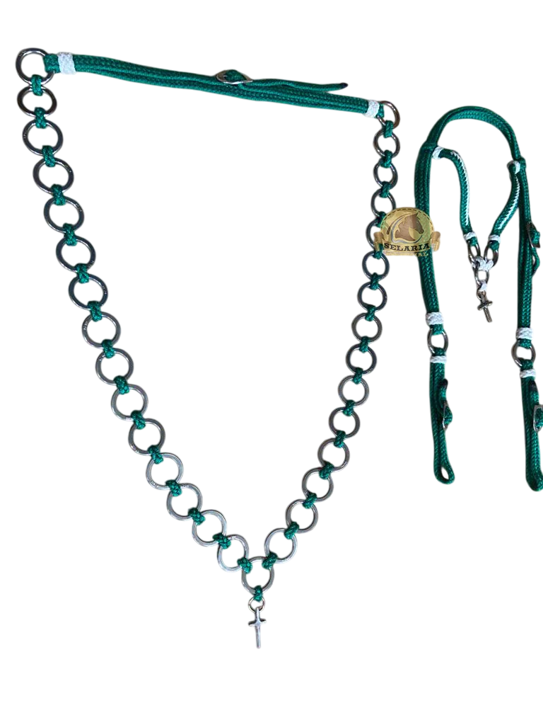 Peitoral produzido em corda poli extra macia, todo argolado com argolas em aço inox livre de ferrugem, possui fivelas de coração também em inox