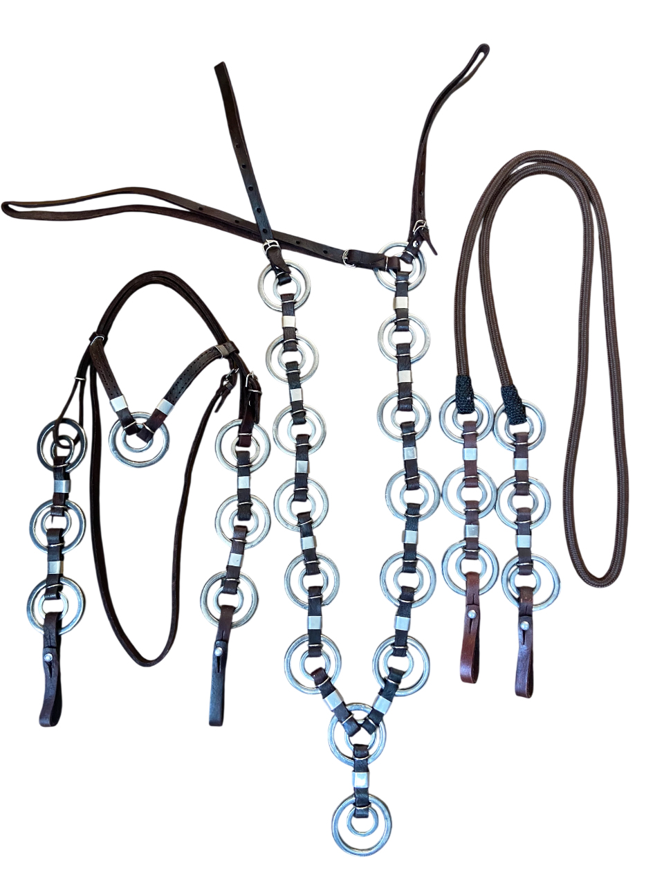 Traia completa em couro marrom com argolas duplas de alumínio, ideal para quem busca resistência, durabilidade e um visual tradicional na lida. Produzida em couro legítimo de alta qualidade, possui acabamento reforçado que garante mais segurança e longa vida útil. As argolas duplas de alumínio são leves, não enferrujam e proporcionam melhor desempenho no uso diário. Um conjunto funcional, confortável para o animal e perfeito para quem valoriza um equipamento bonito e confiável.