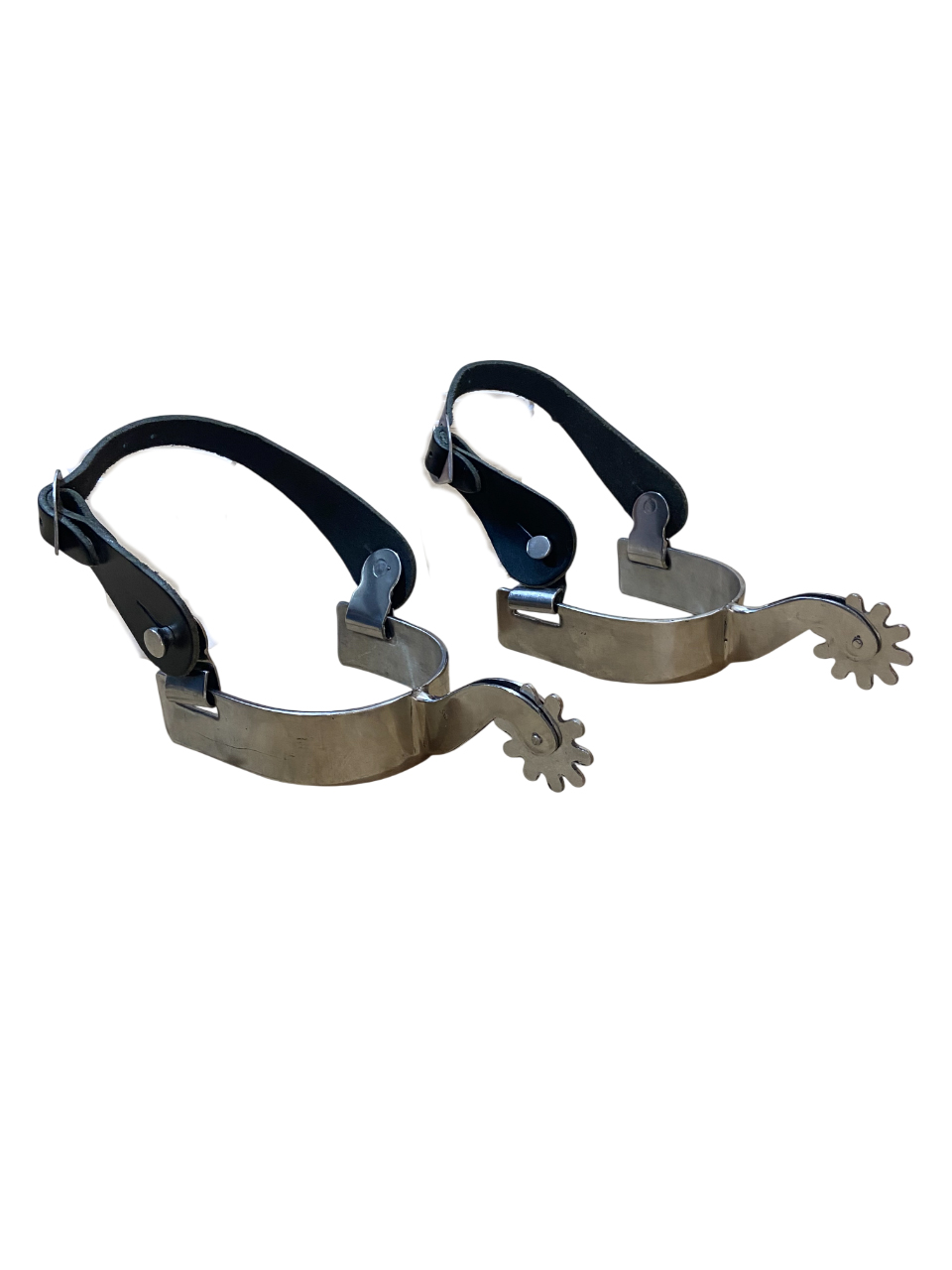 Fabricada em aço inox, livre de ferrugens. Articulada. Cão com 2,5 polegadas de profundidade por 3 polegadas de largura. Roseta maior, com 8 bicos. Acompanha correias em couro de brinde.