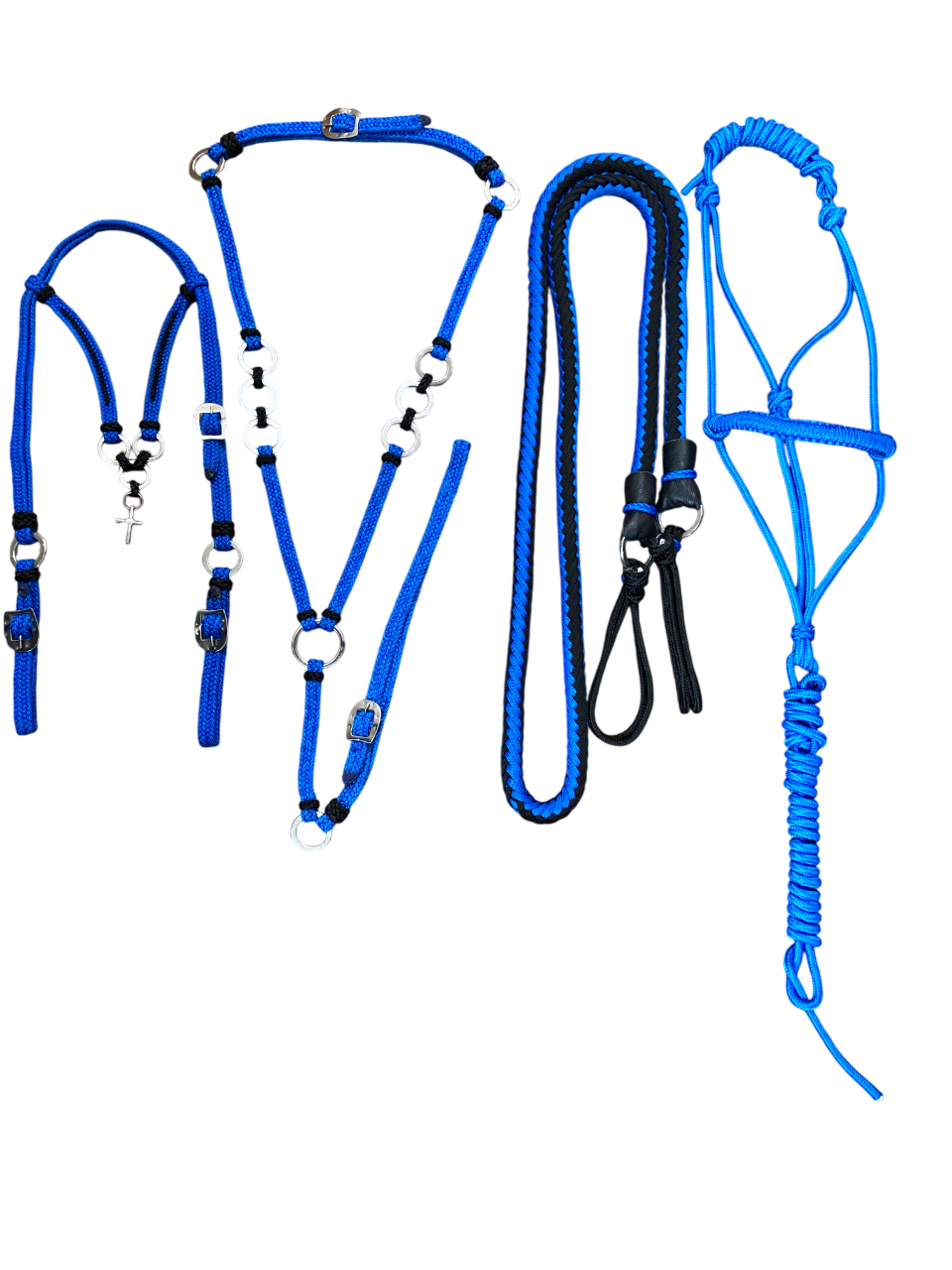 Kit completo em cordinha azul, desenvolvido para oferecer resistência, conforto e um visual elegante ao seu cavalo. O conjunto é composto por cabeçada, cabresto, peitoral e rédea de cordinha, todos confeccionados com corda de alta qualidade, garantindo durabilidade e excelente acabamento.