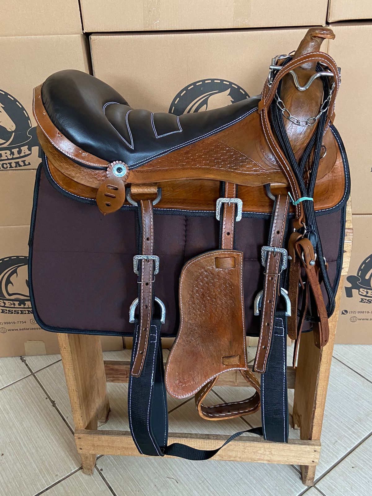 Ótima sela para você que procura um produto feito de couro legítimo. Super durável, pois sua armação é de fibra de vidro, bem leve, com uma resistência incomparável. Muito confortável para cavalgar por horas porque seu assento é todo desenhado e em espuma de alta densidade em couro legítimo. Proporciona conforto também para o animal, pois e toda forrada por feltro, evitando atrito do couro diretamente com o pelo. A sela já vem completa com todos os itens necessários para montaria, só comprar e aproveitar!