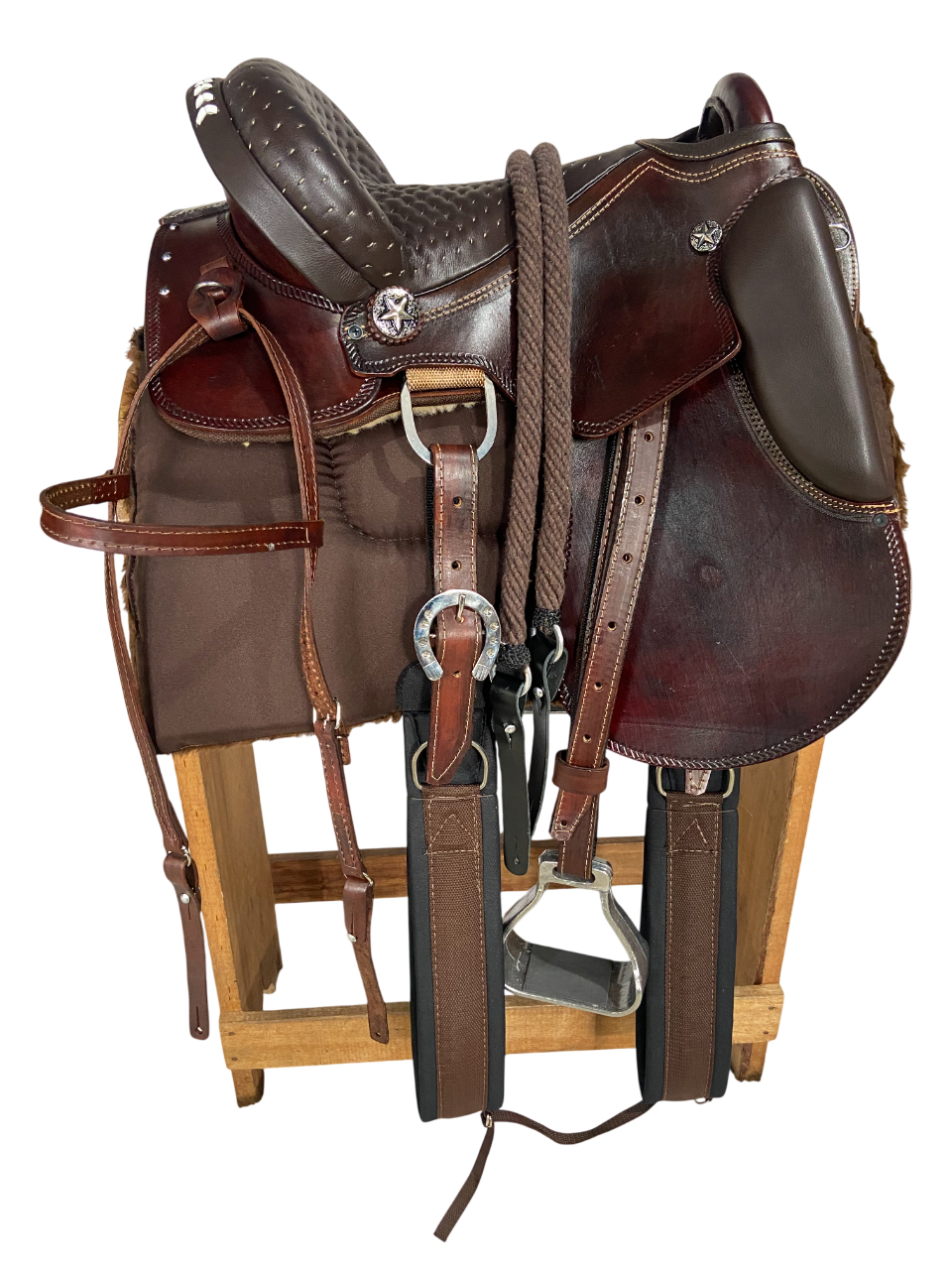 Produto de altíssima qualidade, conforto e beleza, composto das melhores matérias primas: Couro de búfalo, ferragens em inox, fibra de vidro e suador de Neoprene Importado, algo que proporciona maior estabilidade do cavaleiro/amazona sobre a Sela durante a utilização da mesma.