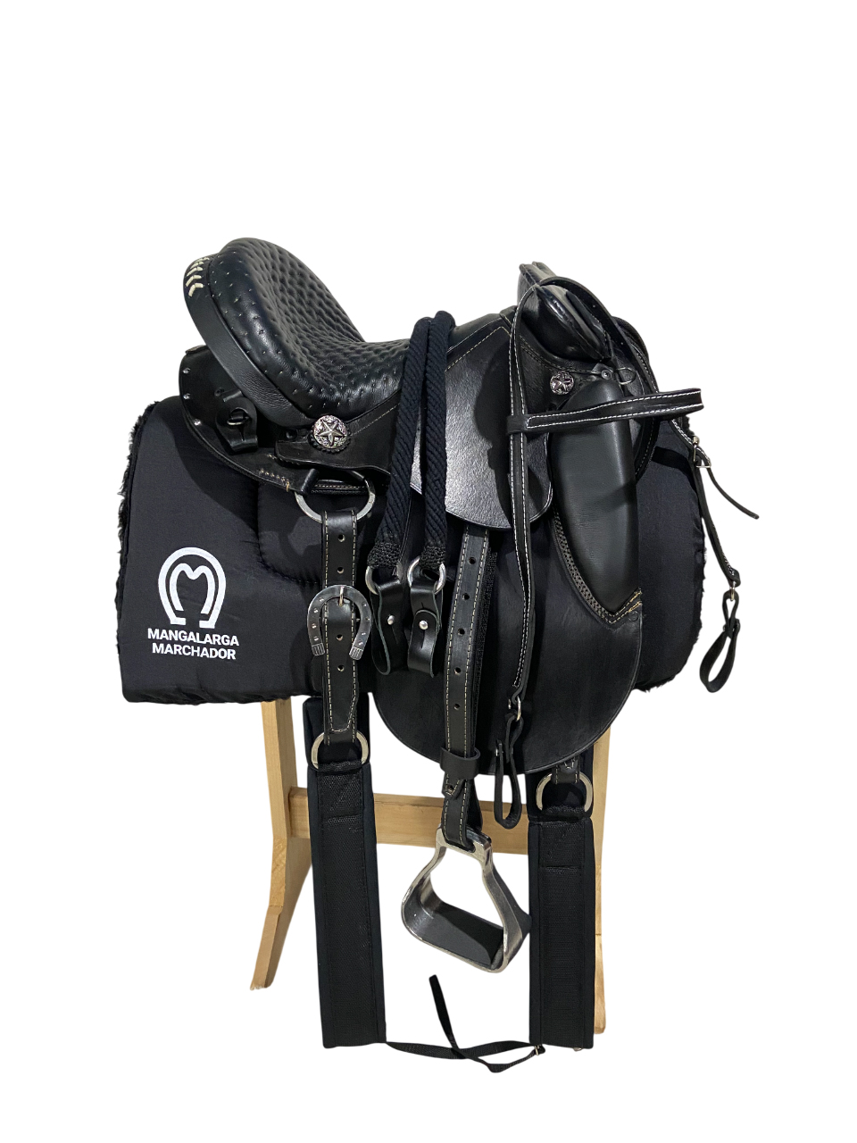 Produto de altíssima qualidade, conforto e beleza, composto das melhores matérias primas: Couro de búfalo, ferragens em inox, fibra de vidro e suador de Neoprene Importado, algo que proporciona maior estabilidade do cavaleiro/amazona sobre a Sela durante a utilização da mesma.