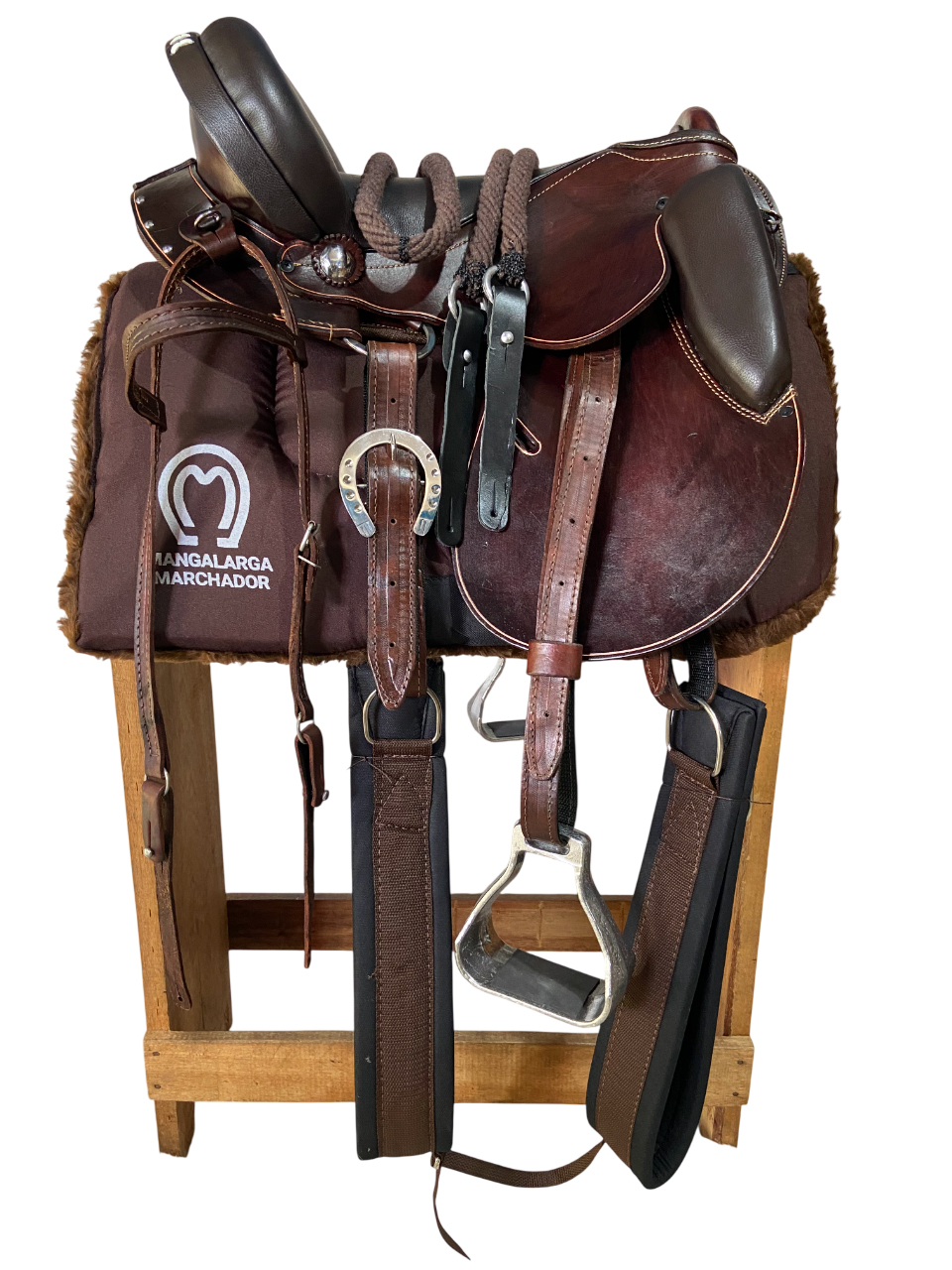 Produto de altíssima qualidade, conforto e beleza, composto das melhores matérias primas: Couro de búfalo, ferragens em inox, fibra de vidro e suador de couro, algo que proporciona maior estabilidade do cavaleiro/amazona sobre a Sela durante a utilização da mesma.