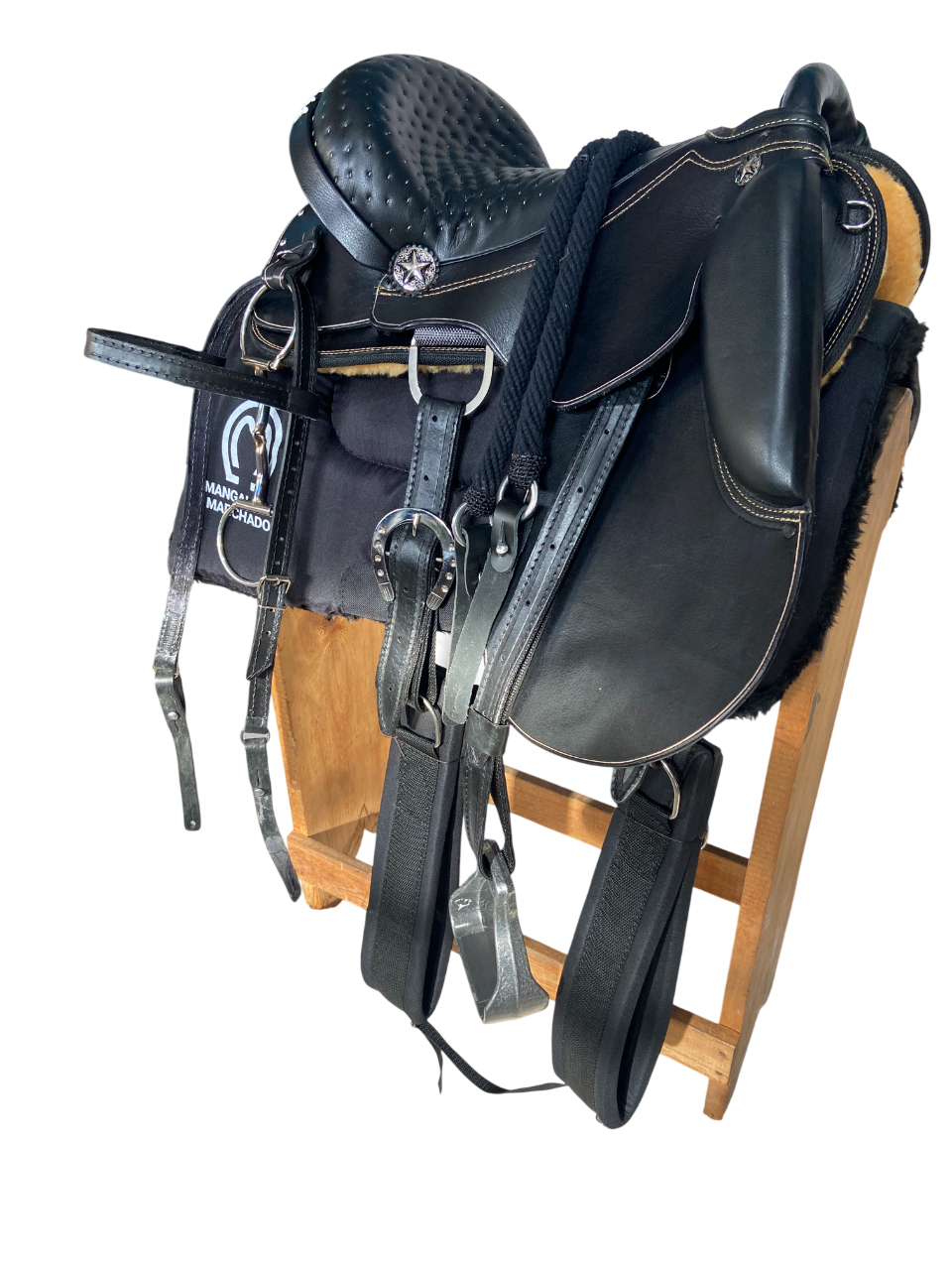 Produto de altíssima qualidade, conforto e beleza, composto das melhores matérias primas: Couro de búfalo, ferragens em inox, fibra de vidro e suador de Neoprene Importado, algo que proporciona maior estabilidade do cavaleiro/amazona sobre a Sela durante a utilização da mesma.