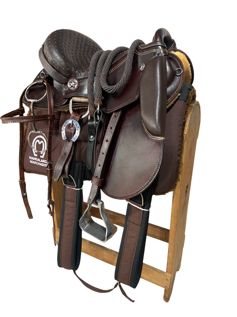 Produto de altíssima qualidade, conforto e beleza, composto das melhores matérias primas: Couro de búfalo, ferragens em inox, fibra de vidro e suador de Neoprene Importado, algo que proporciona maior estabilidade do cavaleiro/amazona sobre a Sela durante a utilização da mesma.