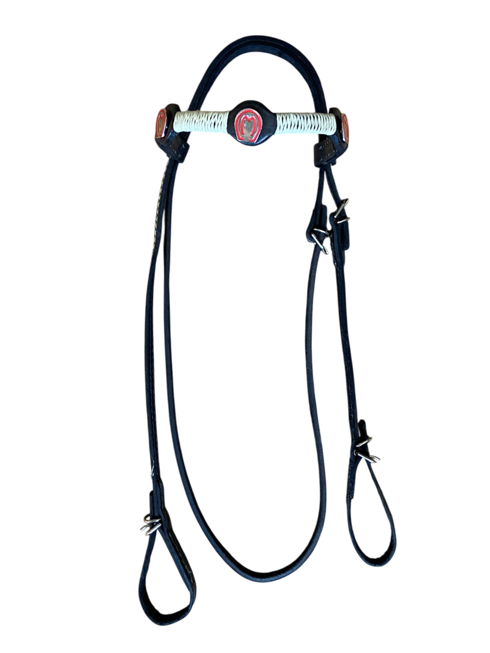 1 Un - Cabeçada confeccionada em couro legítimo de búfalo tratado e argolas em alumínio polido com apliques Mangalarga Marchador e Sujigola.
